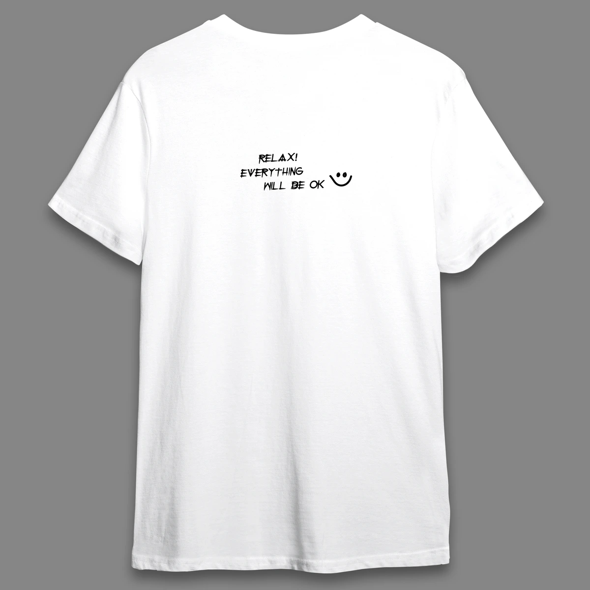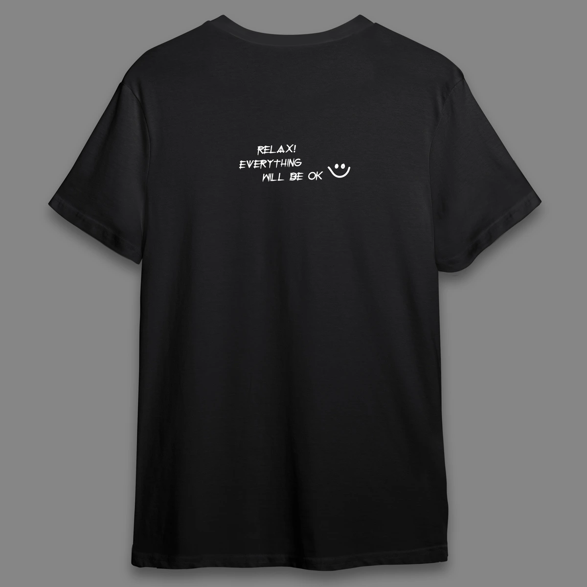 “Spread positivity with this feel-good tee! Featuring the uplifting quote ‘Smile – relax, everything will be okay,’ this shirt is a perfect reminder to stay calm and keep smiling, no matter what life throws your way.”